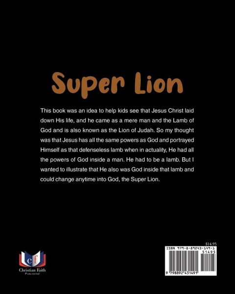 This book was an idea to help kids see that Jesus Christ laid down His life, and he came as a mere man and the Lamb of God and is also known as the Lion of Judah. So my thought was that Jesus has all the same powers as God and portrayed Himself as that defenseless lamb when in actuality, He had all the powers of God inside a man. He had to be a lamb. But I wanted to illustrate that He also was God inside that lamb and could change anytime into God, the Super Lion.