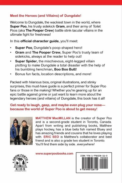 Meet the Heroes (and Villains) of Dungdale! Welcome to Dungdale, the wackiest town in the world, where Super Poo, his trusty sidekick Gram, and their army of Toilet Poos (aka The Pooper Crew) battle stink-tacular villains in the ultimate fight for freshness! In this official character guide, you'll meet:Super Poo, Dungdale's poop-shaped hero! Gram and The Pooper Crew, Super Poo's trusty team of sidekicks, always at the reader to help out! Super Spider, the mischievous, eight-legged villain plotting to make Dungdale a total disaster with the help of his bumbling henchman, Boo Boo Butt! Bonus fun facts, location descriptions, and more! Packed with hilarious bios, original illustrations, and stinky surprises, this must-have guide is a perfect primer for Super Poo fans or those in the making! Whether you're gearing up for an epic battle against grime or just want to learn more about the legendary heroes (and villains) of Dungdale, this book has it all! Get ready to laugh, gasp, and maybe even plug your nose-because the world of Super Poo is about to get messy!