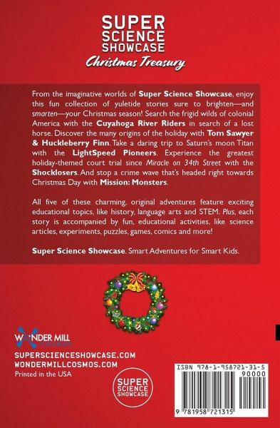 From the imaginative worlds of Super Science Showcase, enjoy this fun collection of yuletide stories sure to brighten-and smarten-your Christmas season! Explore the frigid wilds of colonial America with the Cuyahoga River Riders in search of a lost horse. Discover the many origins of the holiday with Tom Sawyer & Huckleberry Finn. Take a daring trip to Saturn's moon Titan with the LightSpeed Pioneers. Experience the greatest holiday-themed court trial since Miracle on 34th Street with the Shocklosers. And stop a crime wave that's headed right towards Christmas Day with Mission: Monsters. All five of these charming, original adventures feature exciting educational topics, like history, language arts and STEM. Plus, each story is accompanied with fun, educational activities, like science articles, experiments, puzzles, games, comics and more! Super Science Showcase. Smart Adventures for Smart Kids.