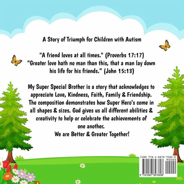 A Story of Triumph for Children with Autism "A friend loves at all times." (Proverbs 17:17) "Greater love hath no man than this, that a man lay down his life for his friends." (John 15:13) My Super Special Brother is a story that acknowledges to appreciate Love, Kindness, Faith, Family & Friendship. The composition demonstrates how Super Hero's come in all shapes and sizes. God gives us all different abilities and creativity to help or celebrate the achievements of one another. We are Better and Greater Together!