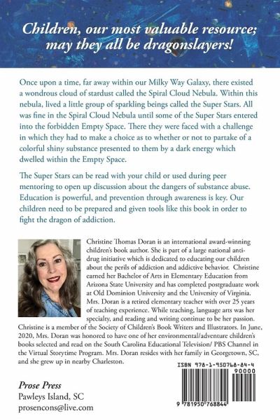 Once upon a time, far away within our Milky Way Galaxy, there existed a wondrous cloud of stardust called the Spiral Cloud Nebula. Within this nebula, lived a little group of sparkling beings called the Super Stars. All was fine in the Spiral Cloud Nebula until some of the Super Stars entered into the forbidden Empty Space. There they were faced with a challenge in which they had to make a choice as to whether or not to partake of a colorful shiny substance presented to them by a dark energy which dwelled within the Empty Space. The Super Stars can be read with your child or used during peer mentoring to open up discussion about the dangers of substance abuse. Education is powerful, and prevention through awareness is key. Our children need to be prepared and given tools like this book in order to fight the dragon of addiction.