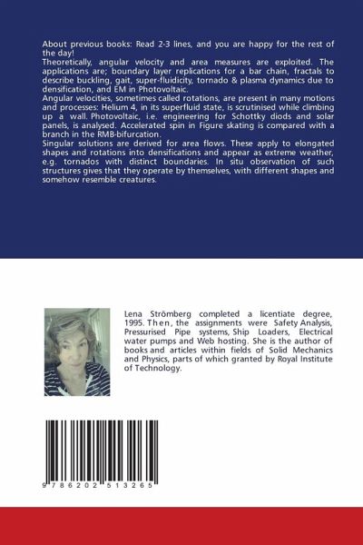 About previous books: Read 2-3 lines, and you are happy for the rest of the day!Theoretically, angular velocity and area measures are exploited. The applications are; boundary layer replications for a bar chain, fractals to describe buckling, gait, super-fluidicity, tornado & plasma dynamics due to densification, and EM in Photovoltaic.Angular velocities, sometimes called rotations, are present in many motions and processes: Helium 4, in its superfluid state, is scrutinised while climbing up a wall. Photovoltaic, i.e. engineering for Schottky diods and solar panels, is analysed. Accelerated spin in Figure skating is compared with a branch in the RMB-bifurcation. Singular solutions are derived for area flows. These apply to elongated shapes and rotations into densifications and appear as extreme weather, e.g. tornados with distinct boundaries. In situ observation of such structures gives that they operate by themselves, with different shapes and somehow resemble creatures.