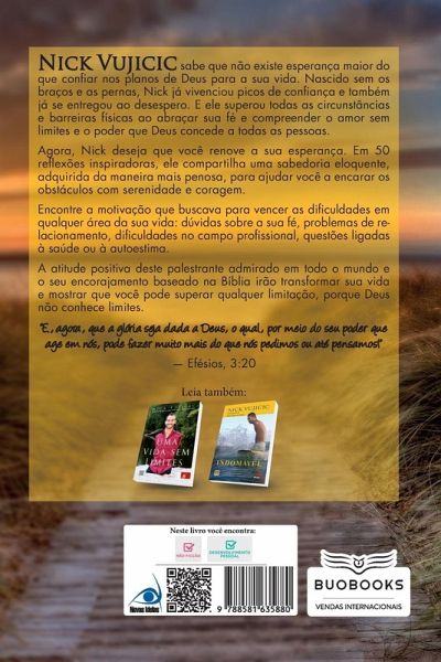Nick Vujicic sabe que não existe esperança maior do que confiar nos planos de Deus para a sua vida. Nascido sem os braços e as pernas, Nick já vivenciou picos de confiança e também já se entregou ao desespero. E ele superou todas as circunstâncias e barreiras físicas ao abraçar sua fé e compreender o amor sem limites e o poder que Deus concede a todas as pessoas. Agora, Nick deseja que você renove a sua esperança. Em 50 reflexões inspiradoras, ele compartilha uma sabedoria eloquente, adquirida da maneira mais penosa, para ajudar você a encarar os obstáculos com serenidade e coragem. Encontre a motivação que buscava para vencer as dificuldades em qualquer área da sua vida: dúvidas sobre a sua fé, problemas de relacionamento, dificuldades no campo profissional, questões ligadas à saúde ou à autoestima. A atitude positiva deste palestrante admirado em todo o mundo e o seu encorajamento baseado na Bíblia irão transformar sua vida e mostrar que você pode superar qualquer limitação, porque Deus não conhece limites.