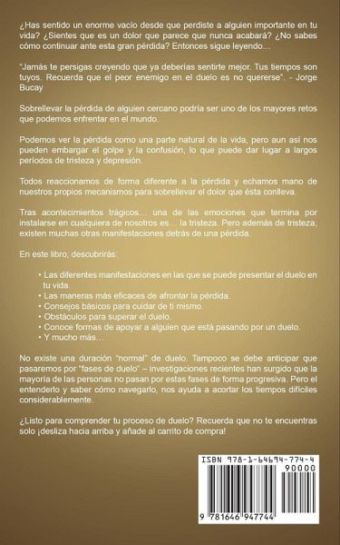 ¿Has sentido un enorme vacío desde que perdiste a alguien importante en tu vida? ¿Sientes que es un dolor que parece que nunca acabará? ¿No sabes cómo continuar ante esta gran pérdida? Entonces sigue leyendo... "Jamás te persigas creyendo que ya deberías sentirte mejor. Tus tiempos son tuyos. Recuerda que el peor enemigo en el duelo es no quererse". - Jorge Bucay Sobrellevar la pérdida de alguien cercano podría ser uno de los mayores retos que podemos enfrentar en el mundo. Podemos ver la pérdida como una parte natural de la vida, pero aun así nos pueden embargar el golpe y la confusión, lo que puede dar lugar a largos períodos de tristeza y depresión. Todos reaccionamos de forma diferente a la pérdida y echamos mano de nuestros propios mecanismos para sobrellevar el dolor que ésta conlleva.Tras acontecimientos trágicos... una de las emociones que termina por instalarse en cualquiera de nosotros es... la tristeza. Pero además de tristeza, existen muchas otras manifestaciones detrás de una pérdida. En este libro, descubrirás: Las diferentes manifestaciones en las que se puede presentar el duelo en tu vida. Las maneras más eficaces de afrontar la pérdida. Consejos básicos para cuidar de ti mismo. Obstáculos para superar el duelo. Conoce formas de apoyar a alguien que está pasando por un duelo. Y mucho más... No existe una duración "normal" de duelo. Tampoco se debe anticipar que pasaremos por "fases de duelo" - investigaciones recientes han surgido que la mayoría de las personas no pasan por estas fases de forma progresiva. Pero el entenderlo y saber cómo navegarlo, nos ayuda a acortar los tiempos difíciles considerablemente. ¿Listo para comprender tu proceso de duelo? Recuerda que no te encuentras solo ¡desliza hacia arriba y añade al carrito de compra!