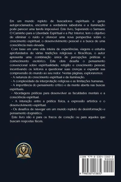 Em um mundo repleto de buscadores espirituais e gurus autoproclamados, encontrar a verdadeira sabedoria e a iluminação pode parecer uma tarefa impossível. Este livro, Superando o Samsara: O Caminho para a Liberdade Espiritual e a Paz Interior, tem o objetivo de eliminar o ruído e oferecer uma nova perspectiva sobre o crescimento espiritual, o desenvolvimento pessoal e a busca de uma consciência mais elevada. Com base em uma vida inteira de experiências, viagens e estudos aprofundados de várias tradições religiosas e filosóficas, o autor apresenta uma combinação única de percepções práticas e conhecimento esotérico. Esta obra desafia o pensamento convencional sobre espiritualidade, religião e crescimento pessoal, incentivando os leitores a questionar suas crenças e expandir sua compreensão do mundo ao seu redor. Nestas páginas, exploraremos: - A natureza do crescimento espiritual e da iluminação. - A complexidade da interpretação religiosa e as limitações humanas. - A importância do pensamento crítico e da mente aberta nas buscas espirituais. - Abordagens práticas para desenvolver as faculdades mentais e a consciência espiritual. - A interação entre a prática física, a expressão artística e o desenvolvimento espiritual. - Os desafios de navegar em um mundo repleto de desinformação e pensamento dogmático. Este livro não é para os fracos de coração ou para aqueles que buscam respostas fáceis. Ele exige que os leitores se envolvam criticamente com o material, questionem suas suposições e estejam dispostos a explorar verdades incômodas. O estilo direto e, às vezes, provocativo do autor pode desafiar os leitores, mas serve a um propósito: tirar você da complacência e inspirar um verdadeiro crescimento espiritual e intelectual. Quer você seja um buscador espiritual experiente ou alguém que está apenas começando a explorar as questões mais profundas da vida, este livro oferece percepções valiosas e orientação prática para sua jornada. Prepare-se para ter suas perspectivas desafiadas, sua mente expandida e seu espírito despertado ao embarcarmos nesta exploração da consciência, da iluminação e da experiência humana.