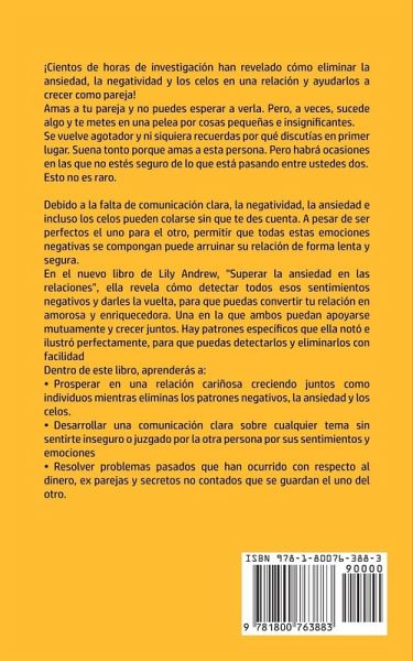¡Cientos de horas de investigación han revelado cómo eliminar la ansiedad, la negatividad y los celos en una relación y ayudarlos a crecer como pareja! Amas a tu pareja y no puedes esperar a verla. Pero, a veces, sucede algo y te metes en una pelea por cosas pequeñas e insignificantes. Se vuelve agotador y ni siquiera recuerdas por qué discutías en primer lugar. Suena tonto porque amas a esta persona. Pero habrá ocasiones en las que no estés seguro de lo que está pasando entre ustedes dos. Esto no es raro. Debido a la falta de comunicación clara, la negatividad, la ansiedad e incluso los celos pueden colarse sin que te des cuenta. A pesar de ser perfectos el uno para el otro, permitir que todas estas emociones negativas se compongan puede arruinar su relación de forma lenta y segura. En el nuevo libro de Lily Andrew, "Superar la ansiedad en las relaciones", ella revela cómo detectar todos esos sentimientos negativos y darles la vuelta, para que puedas convertir tu relación en amorosa y enriquecedora. Una en la que ambos puedan apoyarse mutuamente y crecer juntos. Hay patrones específicos que ella notó e ilustró perfectamente, para que puedas detectarlos y eliminarlos con facilidad Dentro de este libro, aprenderás a: ¿ Prosperar en una relación cariñosa creciendo juntos como individuos mientras eliminas los patrones negativos, la ansiedad y los celos. ¿ Desarrollar una comunicación clara sobre cualquier tema sin sentirte inseguro o juzgado por la otra persona por sus sentimientos y emociones ¿ Resolver problemas pasados que han ocurrido con respecto al dinero, ex parejas y secretos no contados que se guardan el uno del otro. Si ya has intentado resolver tus problemas por tí mismo y aún no ha funcionado, o si ya leiste un libro que simplemente señala tus comportamientos negativos sin brindar ninguna solución del mundo real, no te preocupe. Nunca tuviste un mapa adecuado que te mostrara cómo resolverlo. Este libro te brinda un plan de acción preciso, para que tu y tu pareja puedan prosperar en su relación para bien o para mal.