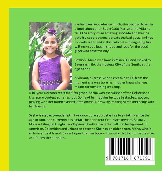 Sasha loves avocados so much, she decided to write a book about one! SuperCado Man and the Villains tells the story of an amazing avocado and how he gets his super powers, defeats the bad guys, and has fun with his friends. This colorful and engaging tale will make you laugh, shout, and root for the good guys who save the day!