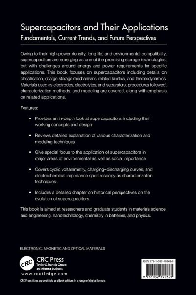 Owing to their high-power density, long life, and environmental compatibility, supercapacitors are emerging as one of the promising storage technologies, but with challenges around energy and power requirements for specific applications. This book focusses on supercapacitors including details on classification, charge storage mechanisms, related kinetics, and thermodynamics. Materials used as electrodes, electrolytes, and separators, procedures followed, characterization methods, and modeling are covered, along with emphasis on related applications.