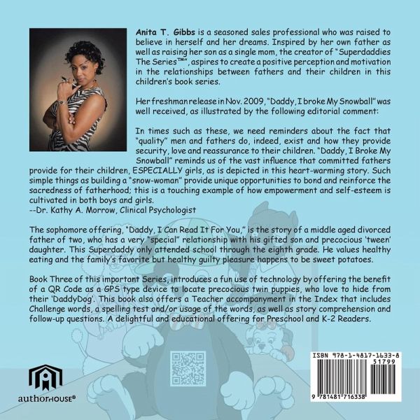 This fun and exciting Pre-k-2nd grade Childrens book is a fun take on technology and the use of a QR Code (Quick Response) in exchange for a GPS type device or Microchip that could be used to locate or find a child. Used on twin puppies in this book, and admnistered by a 'VetDog', Pre-School-2nd grade children will understand the fun use of a 'stamp' and the definition of a QR Code. They will also find that the twins may run, but cannot hide from their "DaddyDog", the SuperDaddy for this book of the Series. Also included is a Teacher Accompaniment with challenge words, spelling word options and comprehension questions to enhance any fun and educational reading experience. QR Code definition: A Quick Response Code is a two dimentional matrix (2D) barcode that is usually enabled by use of a camera ready cell phone (smartphone) or a QR Code bar-code reader. The QR Code provided in this book takes one directly to the Authors website.
