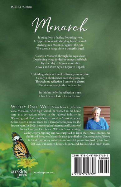 It hung from a leafless flowering stem. I clipped it loose still dangling from the reed. Arching in a Mason jar against the rim, The cocoon hangs from a butterfly weed. Clearly a Monarch through the aqua clear. Developing wings folded in orange and black. Day after day as it grew to me dear. A week and three days it began to unpack. Unfolding wings as it walked from palm to palm. Calmly it climbs back onto the glossy jar. Through my reflection I can see its charm. The ride we take in the car is not far. In this butterfly the reflection is me. Over forested Lakes, I tossed it free. Wesley Dale Willis was born in Jefferson City, Missouri. After high school, he worked in his home state as a corrections officer, in the railroad industry in Wyoming and Utah, and then returned to Missouri, where he has driven a tanker truck for a transport company for the last ten years. In 2003, he received an International Library of Poetry Laureate Certificate. When he's not writing, Wesley enjoys hunting and was surprised to learn that Daniel Boone, his childhood hero, was his ninth great-grandfather. Supererogatory of Poetry is his debut poetry collection-powerful poems inspired by lost love, first love, war, nature, beauty, humor, and death, and so much more.