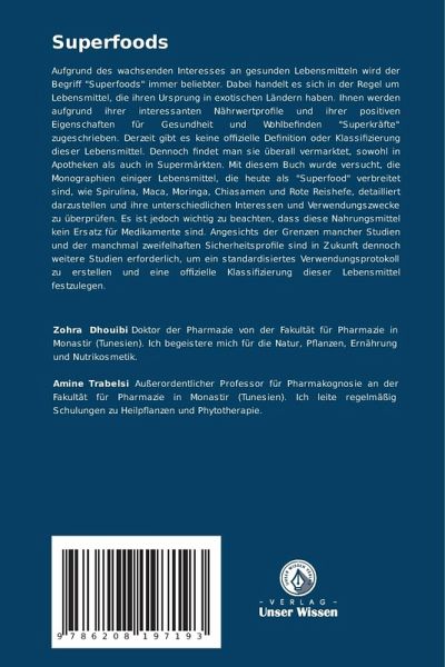 Aufgrund des wachsenden Interesses an gesunden Lebensmitteln wird der Begriff "Superfoods" immer beliebter. Dabei handelt es sich in der Regel um Lebensmittel, die ihren Ursprung in exotischen Ländern haben. Ihnen werden aufgrund ihrer interessanten Nährwertprofile und ihrer positiven Eigenschaften für Gesundheit und Wohlbefinden "Superkräfte" zugeschrieben. Derzeit gibt es keine offizielle Definition oder Klassifizierung dieser Lebensmittel. Dennoch findet man sie überall vermarktet, sowohl in Apotheken als auch in Supermärkten. Mit diesem Buch wurde versucht, die Monographien einiger Lebensmittel, die heute als "Superfood" verbreitet sind, wie Spirulina, Maca, Moringa, Chiasamen und Rote Reishefe, detailliert darzustellen und ihre unterschiedlichen Interessen und Verwendungszwecke zu überprüfen. Es ist jedoch wichtig zu beachten, dass diese Nahrungsmittel kein Ersatz für Medikamente sind. Angesichts der Grenzen mancher Studien und der manchmal zweifelhaften Sicherheitsprofile sind in Zukunft dennoch weitere Studien erforderlich, um ein standardisiertes Verwendungsprotokoll zu erstellen und eine offizielle Klassifizierung dieser Lebensmittel festzulegen.