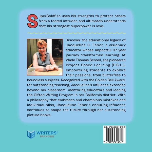 Synopsis: SuperGoldfish uses his strengths to protect others from a feared intruder, and ultimately understands that his strongest superpower is love. Autobiography: Discover the educational legacy of Jacqueline H. Faber, a visionary educator whose impactful 37-year journey transformed learning. At Wade Thomas School, she pioneered Project Based Learning (P.B.L.), empowering students to explore their passions, from butterflies to boundless subjects. Recognized with the Golden Bell Award, for outstanding teaching, Jacqueline's influence extended beyond her classroom, mentoring educators and leading the Gifted Writing Program in her California district. With a philosophy that embraces and champions mistakes and individual bliss, Jacqueline Faber's enduring influence continues to shape the future through her outstanding picture books.
