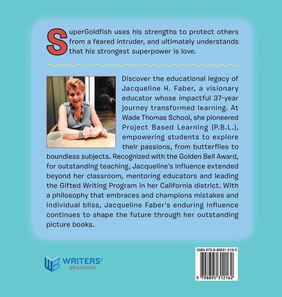 Synopsis: SuperGoldfish uses his strengths to protect others from a feared intruder, and ultimately understands that his strongest superpower is love. Autobiography: Discover the educational legacy of Jacqueline H. Faber, a visionary educator whose impactful 37-year journey transformed learning. At Wade Thomas School, she pioneered Project Based Learning (P.B.L.), empowering students to explore their passions, from butterflies to boundless subjects. Recognized with the Golden Bell Award, for outstanding teaching, Jacqueline's influence extended beyond her classroom, mentoring educators and leading the Gifted Writing Program in her California district. With a philosophy that embraces and champions mistakes and individual bliss, Jacqueline Faber's enduring influence continues to shape the future through her outstanding picture books.