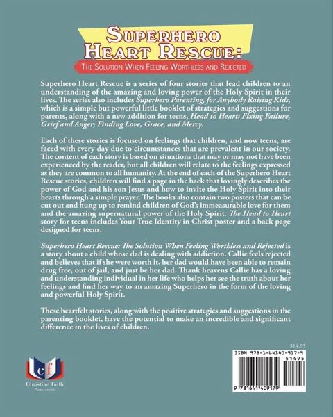 Superhero Heart Rescue is a series of four stories that lead children to an understanding of the amazing and loving power of the Holy Spirit in their lives. The series also includes Superhero Parenting, for Anybody Raising Kids, which is a simple but powerful little booklet of strategies and suggestions for parents, along with a new addition for teens, Head to Heart: Fixing Failure, Grief and Anger; Finding Love, Grace, and Mercy. Each of these stories is focused on feelings that children, and now teens, are faced with every day due to circumstances that are prevalent in our society. The content of each story is based on situations that may or may not have been experienced by the reader, but all children will relate to the feelings expressed as they are common to all humanity. At the end of each of the Superhero Heart Rescue story, children will find the Back Page that lovingly describes the power of God and his son Jesus and how to invite the Holy Spirit into their hearts through a simple prayer. The books also contain two posters that can be cut out and hung up to remind children of God's immeasurable love for them and the amazing supernatural power of the Holy Spirit. The Head to Heart story for teens includes Your True Identity in Christ poster and a Back Page designed for teens. Superhero Heart Rescue: The Solution When Feeling Worthless and Rejected is a story about a child whose dad is dealing with addiction. Callie feels rejected and believes that if she were worth it, her dad would have been able to remain drug free, out of jail, and just be her dad. Thank heavens Callie has a loving and understanding individual in her life who helps her see the truth about her feelings and find her way to an amazing Superhero in the form of the loving and powerful Holy Spirit. These heartfelt stories, along with the positive strategies and suggestions in the parenting booklet, have the potential to make an incredible and significant difference in the lives of children.