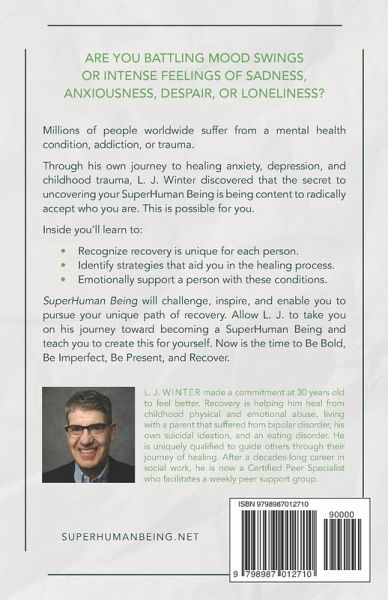 Are you battling mood swings or intense feelings of sadness, anxiousness, despair, or loneliness? Millions of people worldwide suffer from a mental health condition, addiction, or trauma. Through his own journey to healing anxiety, depression, and childhood trauma, L. J. Winter discovered that the secret to uncovering your SuperHuman Being is being content to radically accept who you are. This is possible for you. Inside you'll learn to: * Recognize recovery is unique for each person. * Identify strategies that aid you in the healing process. * Emotionally support a person with these conditions. SuperHuman Being will challenge, inspire, and enable you to pursue your unique path of recovery. Allow L. J. to take you on his journey toward becoming a SuperHuman Being and teach you to create this for yourself. Now is the time to Be Bold, Be Imperfect, Be Present, and Recover. L. J. Winter made a commitment at 30 years old to feel better. Recovery is helping him heal from childhood physical and emotional abuse, living with a parent that suffered from bipolar disorder, his own suicidal ideation, and an eating disorder. He is uniquely qualified to guide others through their journey of healing. After a decades-long career in social work, he is now a Certified Peer Specialist who facilitates a weekly peer support group.