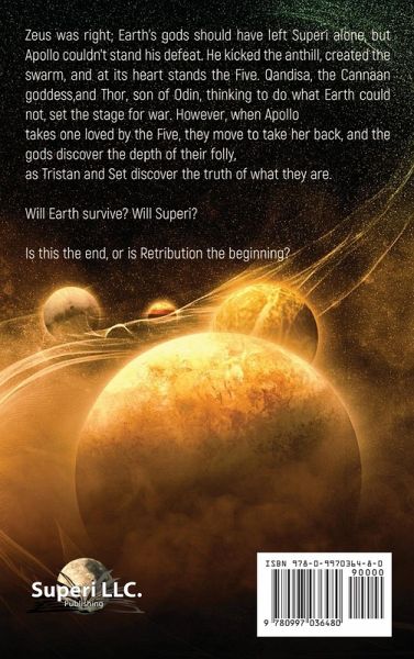 Zeus was right; Earth's gods should have left Superi alone, but Apollo couldn't stand his defeat. He kicked the anthill, created the swarm, and at its heart stands the Five. Qandisa, the Cannaan goddess,and Thor, son of Odin, thinking to do what Earth could not, set the stage for war. However, when Apollo takes one loved by the Five, they move to take her back, and the gods discover the depth of their folly, as Tristan and Set discover the truth of what they are. Will Earth survive? Will Superi? Is this the end, or is Retribution the beginning?