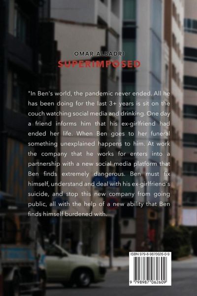 In Ben's world, the pandemic never ended. All he has been doing for the last 3+ years is sitting on the couch watching social media and drinking. One day a friend informs him that his ex-girlfriend has ended her life. When Ben goes to her funeral something unexplained happens to him. At work the company that he works for enters into a partnership with a new social media platform that Ben finds troubling. Ben must fix himself, understand and deal with his ex-girlfriend's suicide, and stop this new company from going public, all with the help of a new ability that Ben finds himself burdened with. Read the exciting new novel by Omar AlBadri - Superimposed