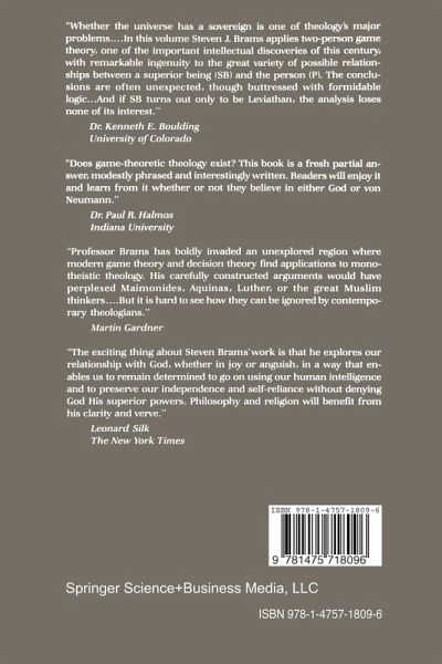 The central question I pose in this book is: If there existed a supe rior being who possessed the supernatural qualities of omni science, omnipotence, immortality, and incomprehensibility, how would he/she act differently from us, and would these differences be knowable? (ßecause God, the superior being in the Judeo Christian tradition, is generally described as a male, I shall hence forth use the masculine pronoun form for convenience, but I intend no invidious gender distinctions, whether applied to super natural or natural beings.l Theologians, philosophers of religion, and erudite scholars in other disciplines have addressed this and related questions before, but their answers, generally speaking, have not been informed by any systematic or rigorous theory. I believe the mathematical theory of games, which has little to do with the frivolity and playfulness we normally associate with games, provides a powerful tool for clarifying the key theo logical concepts in my central question and drawing out their implications in games played between human and superior beings. I am fully aware that not everybody will agree that omni science, omnipotence, immortality, and incomprehensibility are what I say they are, but I invite them to propose their own defi- Preface viii nitions and derive their own conclusions with the aid of the theory. By endowing these protean concepts with unambiguous meanings, I will try to show how game theory can breathe life into questions that have been dismissed too quickly simply because they are metaphysical-outside the world of experience.