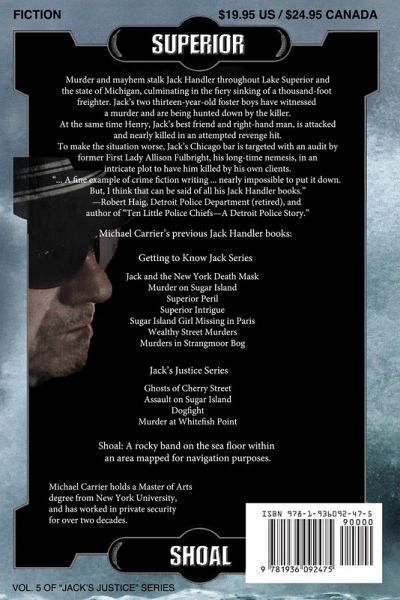 Skydiving onto the deck of a moving freighter…at night…and then add bombs and explosions… In Superior Shoal, murder and mayhem stalk Jack Handler throughout the Great Lakes, culminating in the fiery sinking of a thousand-foot freighter in Lake Superior. The greatest challenge of his life…at night… His two fourteen-year-old foster boys have witnessed a murder and are being hunted down by the killer. At the same time Henry, Jack's best friend and right-hand man, is assaulted and nearly killed in an attempted revenge attack. To make the situation worse, his Chicago bar is targeted with an audit by former First Lady Allison Fulbright, his long-time nemesis, in an intricate plot to have him killed by his own clients. With everything except the sky crashing down on him, Jack calls on his daughter Kate, a New York City homicide detective, to come to their aid. Together with their good friend, Secret Service Agent Roger Minsk, they struggle through the greatest challenge of their lives.