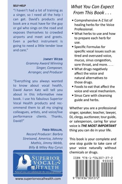 Whether you are a professional singer, speaker, teacher, lawyer, DJ, clergy, auctioneer, tour guide, or sales person. caring for your voice is THE MOST IMPORTANT thing you can do in your life.This book is your complete and one stop guide to take care of your voice naturally without chemicals or drugs. What you can expect from this book: *Comprehensive A-Z list of healing herbs for the Voice Professional *What herbs to use when and how to prepare each herb for use *Specific Formulas for specific vocal issues such as tired and over used voice, mucus,sinus congestion, sore throat and more... *What drugs negatively affect the voice and natural alternatives to those drugs. *Foods to eat that affect the voice and vocal mechanism. *Sinus Care with cleansing guide and herbs. *Food lists that help create and maintain Superior Vocal health. *"What to do When" natural solutions for the most pressing Performance and Presentation issues such as performance anxiety, clogged sinuses, chest congestion, mental clarity and more. David Aaron Katz is a professional Opera singer, Cantor, Nutritional Consultant, Herbalist and CEO of Superior Vocal Health.com. His life mission is to help Voice Professionals from around the world to learn how to heal, maintain and strengthen their voices naturally without chemical or drugs.