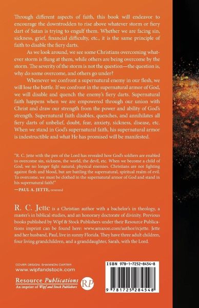 Through different aspects of faith, this book will endeavor to encourage the downtrodden to rise above whatever storm or fiery dart of Satan is trying to engulf them. Whether we are facing sin, sickness, grief, financial difficulty, etc., it is the same principle of faith to disable the fiery darts. As we look around, we see some Christians overcoming whatever storm is flung at them, while others are being overcome by the storm. The severity of the storm is not the question--the question is, why do some overcome, and others go under? Whenever we confront a supernatural enemy in our flesh, we will lose the battle. If we confront in the supernatural armor of God, we will disable and quench the enemy's fiery darts. Supernatural faith happens when we are empowered through our union with Christ and draw our strength from the power and ability of God's strength. Supernatural faith disables, quenches, and annihilates all fiery darts of unbelief, doubt, fear, anxiety, sickness, disease, etc. When we stand in God's supernatural faith, his supernatural armor is indestructible and what He has promised will be manifested.