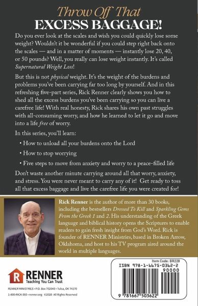 Throw Off That Excess Baggage! Do you ever look at the scales and wish you could quickly lose some weight? Wouldn't it be wonderful if you could step right back onto the scales - and in a matter of moments - instantly lose 20, 40, or 50 pounds? Well, you really can lose weight instantly. It's called Supernatural Weight Loss!¿¿ But this is not physical weight. It's the weight of the burdens and problems you've been carrying far too long by yourself. And in this refreshing five-part series, Rick Renner clearly shows you how to shed all the excess burdens you've been carrying so you can live a carefree life! With real honesty, Rick shares his own past struggles with all-consuming worry, and how he learned to let it go and move into a life free of worry. In this series, you'll learn: How to unload all your burdens onto the Lord How to stop worrying Five steps to move from anxiety and worry to a peace-filled life Don't waste another minute carrying around all that worry, anxiety, and stress. You were never meant to carry any of it! Get ready to toss all that excess baggage and live the carefree life you were created for!
