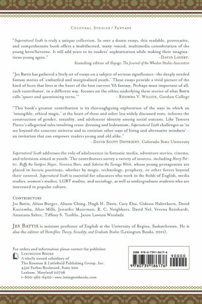 Introduction: Supernatural Youth, by Jes Battis Chapter One: Spiritual, Not Sexual: The Plight of the Adolescent Human Wizard in Diane Duane's Young Wizards Series, by Alice Mills Chapter Two: Magical Learning and Loss: Hermione Granger and the Female Intellectual in Harry Potter, by Alissa Burger Chapter Three: Magic, Adolescence, and Education on Terry Pratchett's Discworld, by Gideon Haberkorn and Verena Reinhardt Chapter Four: "Does the Phrase 'Vampire Slayer' Mean Anything to You?": The Discursive Construction of the Just Woman Warrior Trope in Joss Whedon's Buffy, the Vampire Slayer TV Series, by David Nel Chapter Five: Why Xander Matters: The Extraordinary Ordinary in Buffy the Vampire Slayer, by David Kociemba Chapter Six: "Kinda Gay": Queer Cult Fandom and Willow's (Bi)Sexuality in Buffy the Vampire Slayer, by Jennifer Moorman Chapter Seven: Postfeminism in a Postmodern Landscape: Navigating Difference on Veronica Mars, by Cary Elza Chapter Eight: "Bigger Things to Worry About": Allusions and the British Fantasy Tradition in Hex, by Hugh H. Davis Chapter Nine: Being Harvey Kinkel: The Laws of the Other Realm in Sabrina the Teenage Witch, by Tiffany S. Teofilo Chapter Ten: Closed Minds: Tamora Pierce's Teenagers and the Problem of Desire, by Anastasia Salter Chapter Eleven: Nerds, Geeks, and Dorks, Oh My!: The Teen Wizard as Social Outcast, by R.C. Neighbors Chapter Twelve: Breaking the Spell: Power and Choice in Holly Black's Valiant, by Alison Ching Chapter Thirteen: Enrolling in the 'Hidden School': Timothy Hunter and the Education of the Teenage Comic Book Magus, by Jason L. Winslade About the Contributors Index