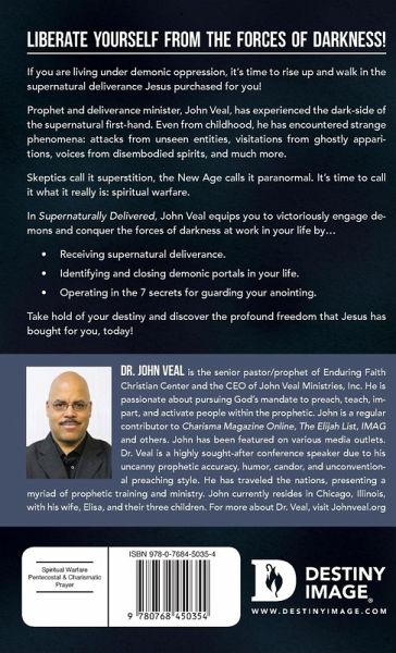Liberate yourself from the forces of darkness! If you are living under demonic oppression, it’s time to rise up and walk in the supernatural deliverance Jesus purchased for you! Prophet and deliverance minister, John Veal, has experienced the dark-side of the supernatural first-hand. Even from childhood, he has encountered strange phenomena: attacks from unseen entities, visitations from ghostly apparitions, voices from disembodied spirits, and much more. Skeptics call it superstition, the New Age calls it paranormal. It’s time to call it what it really is: spiritual warfare. In Supernaturally Delivered, John Veal equips you to victoriously engage demons and conquer the forces of darkness at work in your life by… Receiving supernatural deliverance. Identifying and closing demonic portals in your life. Operating in the 7 secrets for guarding your anointing. Take hold of your destiny and discover the profound freedom that Jesus has bought for you, today!