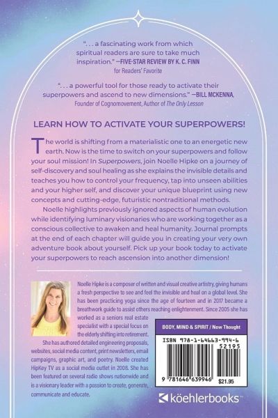 Learn how to activate your superpowers! The world is shifting from a materialistic one to an energetic new earth. Now is the time to switch on your superpowers and follow your soul mission! In Superpowers, join Noelle Hipke on a journey of self-discovery and soul healing as she explains the invisible details and teaches you how to control your frequency, tap into unseen abilities and your higher self, and discover your unique blueprint using new concepts and cutting-edge, futuristic nontraditional methods. Noelle highlights previously ignored aspects of human evolution while identifying luminary visionaries who are working together as a conscious collective to awaken and heal humanity. Journal prompts at the end of each chapter will guide you in creating your very own adventure book about yourself. Pick up your book today to activate your superpowers to reach ascension into another dimension! Transformational Portals: · Activate your DNA and align yourself with your SUPERPOWERS · Evolve into the highest version of yourself to achieve ASCENSION · Lift your vibration with non-traditional FUTURISTIC methods · Tap into other dimensions through EXPANSION · See and feel the invisible to be a VISIONARY · Master the artistry of chartering your own DESTINY · Heal the soul and family timeline to generate more ENERGY · Self-healing revelations transforming MINDSET · Create your own high vibrational intelligent signal and FREQUENCY · Journal your way through an adventure of a LIFETIME. Superpowers illuminates a "WORLDWIDE MOVEMENT" guiding ALL GENERATIONS (Gen Z, Millennials, Gen X, Boomers) teens, college students, families, schools, coaches, counselors, therapists, and individuals how to tap into your higher self with mentors and healers who are revealing themselves to make a difference.