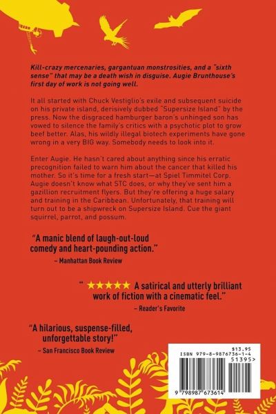 Kill-crazy mercenaries, gargantuan monstrosities, and a "sixth sense" that may be a death wish in disguise. Augie Brunthouse's first day of work is not going well. It all started with Chuck Vestiglio's exile and subsequent suicide on his private island, derisively dubbed "Supersize Island" by the press. Now the disgraced hamburger baron's unhinged son has vowed to silence the family's critics with a psychotic plot to grow beef better. Alas, his wildly illegal biotech experiments have gone wrong in a very BIG way. Somebody needs to look into it. Enter Augie. He hasn't cared about anything since his erratic precognition failed to warn him about the cancer that killed his mother. So it's time for a fresh start - at Spiel Timmitel, Corp. Augie doesn't know what STC does, or why they've sent him a gazillion recruitment flyers. But they're offering a huge salary and training in the Caribbean. Unfortunately, that training will turn out to be a shipwreck on Supersize Island. Cue the giant squirrel, parrot, and possum. "Die Hard meets bizarro Jurassic Park...A manic blend of laugh-out-loud comedy and heart-pounding action." - Manhattan Book Review "A satirical and utterly brilliant work of fiction with a cinematic feel." - Reader's Favorite "A hilarious, suspense-filled, unforgettable story!" - San Francisco Book Review