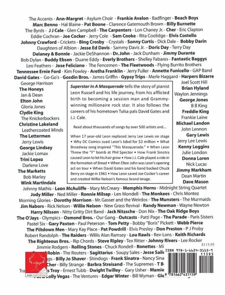 Superstar In A Masquerade tells the story of pianist Leon Russell and his life journey, from his afflicted birth to becoming a session man and Grammy-winning millionaire rock star. It also follows the careers of his hometown Tulsa pals David Gates and J.J. Cale. Read about thousands of songs by over 500 artists and... When 17 year-old Leon replaced Jerry Lee Lewis on stage Why DC Comics sued Leon's label for $2 million What Broadway song inspired "This Masquerade." When Leon Threw the "F" bomb at Phil Spector How Frank Sinatra caused Leon to let his hair grow How J.J. Cale played a role in the formation of Bread When Elton John was Leon's opening act on tour When David Gates and his band backed Chuck Berry on stage in 1961 How Leon saved Joe Cocker's career and created Willie Nelson's famous brand image.