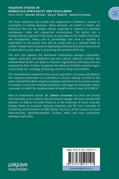 This book addresses how people and organisations sometimes respond to uncertainty in making decisions. Those decisions are rooted in beliefs and behaviours that are not always rational, especially in response to perceived randomness, chaos and unexpected circumstances. The author uses a transdisciplinary approach to the study of superstition in the context of business and management, taking care to acknowledge that what is regarded as superstition to one person may well be constructed as a spiritual belief by another. Respect and sensitivity in explicating individual and social constructions of spirituality is a core value in structuring the narrative of the text.