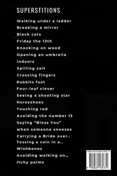 In a world brimming with mysteries, where the line between fact and fiction blurs, there exists a tapestry of beliefs woven into the fabric of human existence. Superstitions, they are called, passed down through generations, whispered in husshed tones, and ebraced with both skepticism and reverence. These tales, rooted in ancient folklore and steeped in the human psyche, have found a way to transcend time, capturing our imaginations and shapig our cultural landscape. In this book I will unravel the stories behind the 20 most popular beliefs, I'll uncover the origins and backstores that have given rise to these enduring superstitions, as well as give you an entertaining creepy story.