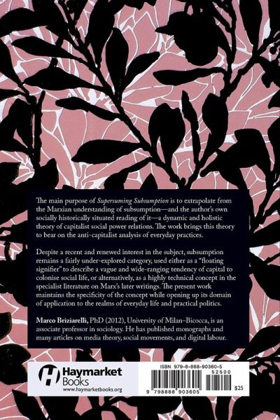 In Supersuming Subsumption, Marco Briziarelli develops a dynamic and holistic theory of capitalist social power and shows how relevant Marx’s theory of subsumption still is for anti-capitalist struggles today. Despite renewed interest in the subject, subsumption remains an underexplored category, used either as a ‘floating signifier’ to describe a vague and wide-ranging tendency of capital to colonise social life, or, alternatively, as a highly technical concept in the specialist literature on Marx's later writings. Based on the Marxian understanding of subsumption, as well as Briziarelli’s socially and historically situated reading of it, the book maintains the specificity of the concept while bringing it to bear on the analysis of everyday life and practical politics.