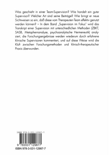 Was geschieht in einer Team-Supervision? Wie handelt ein guter Supervisor? Welcher Art sind seine Beiträge? Wie bringt er neue Sichtweisen so ein, daß diese vom Therapeuten-Team effektiv genutzt werden können? - In dem Band "Supervision im Fokus" wird das Transkript einer Supervision mit unterschiedlichen Methoden (ZBKT, SASB, Metaphernanalyse, psychoanalytische Hermeneutik) analysiert, die Forschungsergebnisse werden wiederum durch erfahrene klinische Supervisoren kommentiert, und auf diese Weise wird die Kluft zwischen Forschungsmethoden und klinisch-therapeutischer Praxis überwunden.