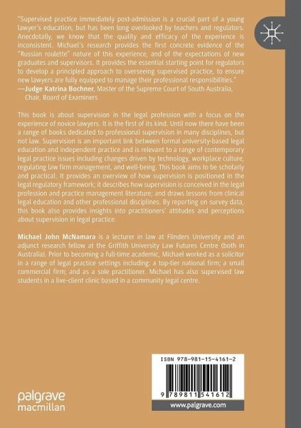This book is about supervision in the legal profession with a focus on the experience of novice lawyers. It is the first of its kind. Until now there have been a range of books dedicated to professional supervision in many disciplines, but not law. Supervision is an important link between formal university-based legal education and independent practice and is relevant to a range of contemporary legal practice issues including changes driven by technology, workplace culture, regulating law firm management, and well-being. This book aims to be scholarly and practical. It provides an overview of how supervision is positioned in the legal regulatory framework; it describes how supervision is conceived in the legal profession and practice management literature; and draws lessons from clinical legal education and other professional disciplines. By reporting on survey data, this book also provides insights into practitioners' attitudes and perceptions about supervision inlegal practice.