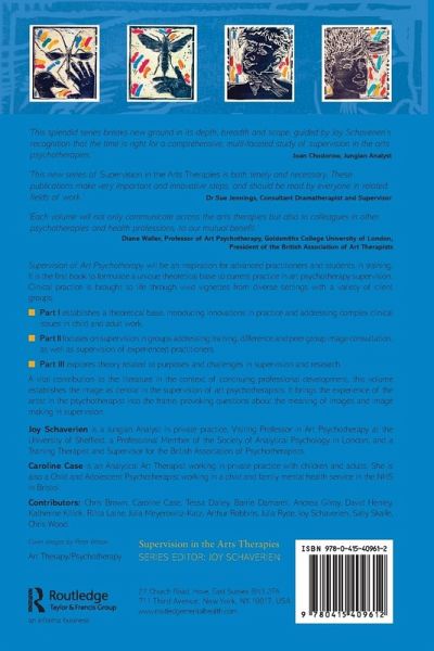 Schaverien Introduction. Case Review of the Literature on Art Therapy Supervision. Part I: Theoretical Innovations in Individual Supervision. Damarell The Supervisor's Eyes. Schaverien Framing Enchantment: Countertransference in Analytical Art Psychotherapy Supervision. Dalley Piecing Together the Jigsaw Puzzle: Thinking about the Clinical Supervision of Art Therapists Working with Children and Young People. Henley Supervisory Responses to Child Art Therapy: Assessment Intervention and Outcome. Case Imagery in Supervision: The Non-verbal Narrative of Knowing. Part II: Theoretical Innovations in Group Supervision. Laine Image Consultation: Supporting the Work of Art Therapists. Skaife Working in Black and White: An Art Therapy Supervision Group. Robbins The Art of Supervision. Brown Meyerowitz-Katz & Ryde Thinking with Image Making: Supervising Student Art Therapists. Part II: Purposes and Challenges in Supervision and Research. Wood Agency and Attention: Purposes of Supervision. Killick Working with Ambivalence in the Clinical Supervision of Art Therapists. Gilroy In Pursuit of an Object: The Supervision of Art Therapy Research.