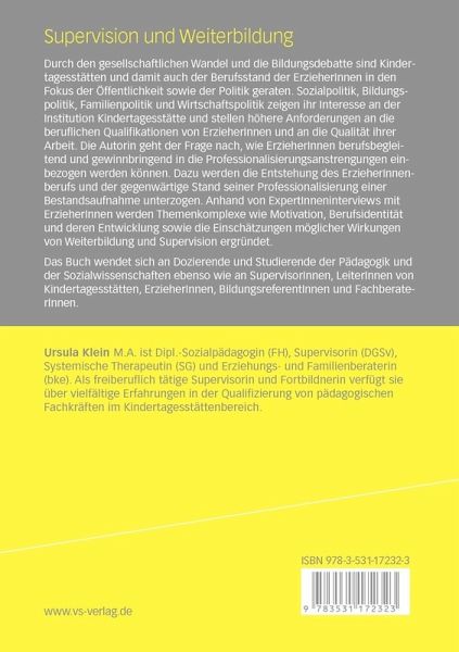 Das Thema Frühpädagogik hat Hochkonjunktur. Im Vordergrund der öffentlichen Auseinandersetzung stehen die Bedeutung der frühen Förderung hinsichtlich der Entwicklungschancen von Kindern und die gestiegenen Anforderungen an die Einrichtungen sowie die Ausbildung der dort professionell Tätigen. Es ist ein besonderes Verdienst der Autorin mit dem vorliegenden Buch den Fokus auf die Erzieherinnen und Erzieher und deren Förderung und Professionalisierung zu richten. Ihr gelingt es, das Thema Frühpädagogik zu erden: Statt wie gehabt Forderungen aufzustellen, die oft abgehoben wirken und eher Brüche als Anknüpfungsmöglichkeiten markieren, zeigt die Autorin tragfähige Verbindungslinien auf. Ursula Klein rekonstruiert fundiert und prägnant die historische Dimension der Entstehung des Erzieherinnenberufs. Kenntnisreich und umfassend informiert sie über den aktuellen Stand der Professionalisierung dieses Berufs und seiner derzeit geltenden politischen, rechtlichen und institutionellen Rahmenbedingungen. Sie entwickelt durchdachte und überzeugende Konzepte für eine fortschreitende Professionalisierung, die Bewährtes mit Innovativem verknüpfen. Präzise und stimmig beschreibt Ursula Klein, wie die Instrumente Weiterbildung und Supervision wirkungsvoll zum Einsatz kommen. Besonders wertvoll für die Leserin und den Leser sind die Fallstudien, die die Autorin anhand von vier Expertinneninterviews darstellt. Vorgehensweisen und Methoden gelungener qualitativer Sozialforschung werden transparent beschrieben. Die durch die sorgfältige Auswertung zu Tage geförderten Ergebnisse geben einen erhellenden Einblick in die erlebte Realität von erfahrenen Erzieherinnen (zum Teil in Leitungsfunktion) in ihren beruflichen Kontexten. Diese werden zu Kernthemen gebündelt undhinsichtlich der Professionalisierungsinstrumente Weiterbildung und Supervision konsequent umgesetzt. Prof. Dr. Klaus Schneider Evangelische Hochschule Freiburg Vorwort