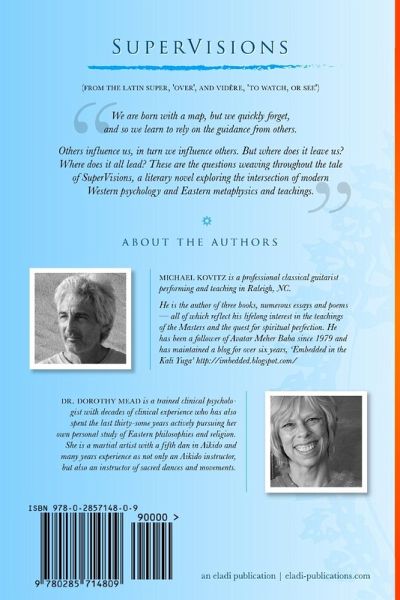 SuperVisions by Dr. Dorothy Mead and Michael Kovitz is a novel that explores the intersection of modern Western psychology and the teachings and metaphysics of the East. (From the Latin super, 'over', and vidêre, 'to watch, or see'.) We are born with a map, but we quickly forget. "children guessed (but only a few and down they forgot as up they grew)." - e.e cummings. And so we learn to rely on the guidance from others whom we presume, we trust, we hope, have a wiser vision. These people influence us, and in turn we influence others. But where does it leave us? Where does it all lead? These are the questions weaving throughout the tale of SuperVisions.