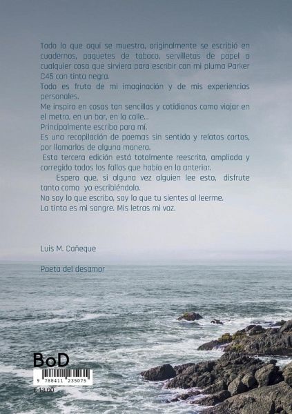 Todo lo que aquí se muestra, originalmente se escribió en cuadernos, paquetes de tabaco, servilletas de papel o cualquier cosa que sirviera para escribir con mi pluma Parker C45 con tinta negra. Todo es fruto de mi imaginación y de mis experiencias personales. Me inspiro en cosas tan sencillas y cotidianas como viajar en el metro, en un bar, en la calle... Principalmente escribo para mí. Es una recopilación de poemas sin sentido y relatos cortos, por llamarlos de alguna manera. Esta tercera edición está totalmente reescrita, ampliada y corregido todos los fallos que había en la anterior. Espero que, si alguna vez alguien lee esto, disfrute tanto como yo escribiéndolo. No soy lo que escribo, soy lo que tu sientes al leerme. La tinta es mi sangre. Mis letras mi voz. Luis M. Cañeque Poeta del desamor