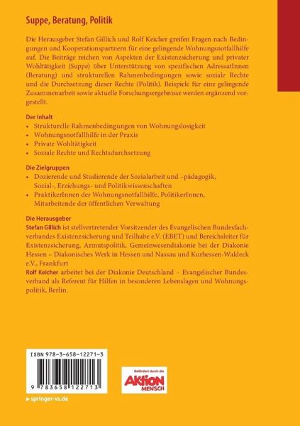 Die Herausgeber Stefan Gillich und Rolf Keicher greifen Fragen nach Bedingungen und Kooperationspartnern für eine gelingende Wohnungsnotfallhilfe auf. Die Beiträge reichen von Aspekten der Existenzsicherung und privater Wohltätigkeit (Suppe) über Unterstützung von spezifischen AdressatInnen (Beratung) und strukturellen Rahmenbedingungen sowie soziale Rechte und die Durchsetzung dieser Rechte (Politik). Beispiele für eine gelingende Zusammenarbeit sowie aktuelle Forschungsergebnisse werden ergänzend vorgestellt.