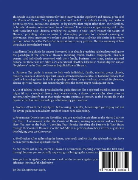 This guide is a specialized resource for those involved in the legislative and judicial process of the Courts of Heaven. The guide is structured to help individuals identify and address potential spiritual accusations, charges, or legal rights that might affect them, their families, or broader domains, often referred to as "metrons." It serves as a supplementary tool to the book "Unveiling Your Identity: Breaking the Barriers in Your Heart through the Courts of Heaven," providing tables to assist in developing petitions for spiritual cleansing or deliverance. More importantly, is to keep your focus on Jesus and what His desire is for every petition. Here's a summary of how the guide is intended to be used: 1. Audience: The guide is for anyone interested in or already practicing spiritual proceedings or the paradigm of the Courts of Heaven, including church leaders, congregants, business owners, and individuals concerned with their family, business, city, state, and national spiritual history. For those who are called: "Generational Bloodline Cleaners", "Giant Slayers" and/or "Legislators" in the Courts of Heaven by judicial law of Heaven. 2. Purpose: The guide is meant to help each individual, family, mission group, church, ministry, and business identify spiritual issues, often linked to ancestral or bloodline history that could be hindering them. It aids in preparing petitions for spiritual courts to seek forgiveness, cleanse spiritual records, and remove legal rights the enemy might hold against them. 3. Use of Tables: The tables provided in the guide function like a spiritual checklist. Just as you might fill out a medical history form when visiting a doctor, these tables allow users to systematically identify areas that might require spiritual attention. To find the needle in the haystack that has been controlling and influencing your metron. 4. Process:-Consult the Holy Spirit: Before using the tables, I encouraged you to pray and ask for divine guidance and wisdom on which issues need addressing. 5. Repentance: -Once issues are identified, you are advised to take them to the Mercy Court or the Court of Atonement within the Courts of Heaven, seeking repentance and resolution. Note: You may use the book - Unveiling Your Identity Breaking the Barriers in Your Heart through the Courts of Heaven 1st or the 2nd Edition as petitions have been written as guides to help bring your case(s)