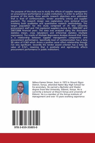 The purpose of this study was to study the effects of supplier management on procurement performance in public institutions. In order to achieve the purpose of this study, three specific research objectives were addressed that is: level of communication, tender awarding criteria and supplier payment. The research design was explanatory cross sectional survey involving both qualitative and quantitative research methodology. The target population for this study comprised of 35 Moi University procurement staff and 154 registered suppliers during the 2006/2007 and 2007/2008 financial years. The data was analyzed using the descriptive statistics (mean, cross tabulation) and inferential statistics (multiple regressions). The results of Multiple Regressions Analysis showed that there is a relationship between supplier management components and procurement performance. Specifically level of communication has a beta (beta) value of 0.063 which shows a positive cause effect relationship though not very significant. Secondly the tender award criterion has a beta (beta) value of 0.521, meaning that it positively and significantly affects procurement performance in public institutions.
