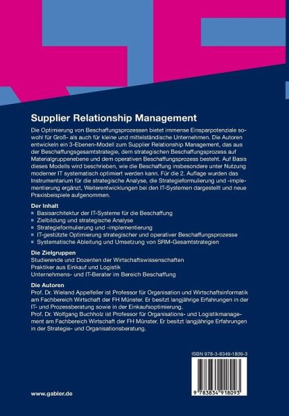 Wieland Appelfeller und Wolfgang Buchholz verstehen Supplier Relationship Management als die von einer Beschaffungsgesamtstrategie ausgehende Gestaltung der strategischen und operativen Beschaffungsprozesse unter Nutzung konventioneller und internetgestützter IT. Als Bezugsrahmen wird das 3-Ebenen-Modell entwickelt, das aus Beschaffungsgesamtstrategie, strategischem Beschaffungsprozess auf Materialgruppenebene und operativem Beschaffungsprozess besteht. Auf Basis dieses Modells wird beschrieben, wie die Beschaffung insbesondere unter Nutzung moderner IT systematisch optimiert werden kann. Für die 2. Auflage wurden das Instrumentarium für die strategische Analyse, die Strategieformulierung und die Strategieimplementierung ergänzt, Weiterentwicklungen bei den IT-Systemen z.B. in den Bereichen Spend Analysis und Lieferantenmanagement dargestellt, die beschriebenen Modelle und Methoden an aktuelle Entwicklungen angepasst und neue Praxisbeispiele aufgenommen.