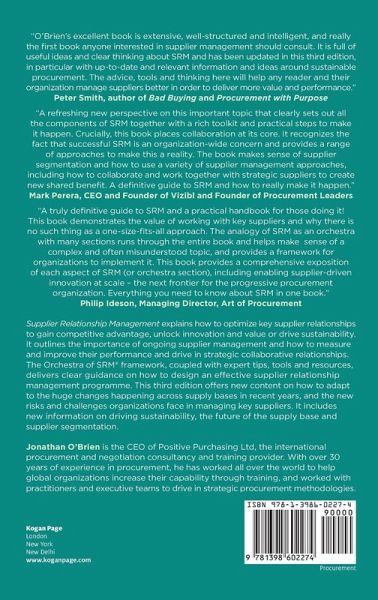 "O'Brien's excellent book is extensive, well-structured and intelligent, and really is the first book anyone interested in supplier management should consult. It is full of useful ideas and clear thinking about SRM, and has been updated in this third edition with relevant information and ideas around sustainable procurement. The advice, tools and thinking here will help any reader and their organization manage suppliers better in order to deliver more value and performance" Peter Smith, Author, 'Bad Buying' and 'Procurement with Purpose'