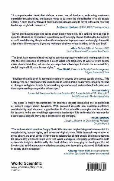Supply Chain 5.0: The Next Generation of Business Success through Customer Centricity, Sustainability & Human Rights and Digitalization" unveils a transformative era in supply chain management, presenting a groundbreaking business model that integrates three pivotal elements: Customer Centricity, Sustainability & Human Rights, and the interplay of Advanced Digitalization. This insightful book guides businesses through the evolving landscape, showcasing how they can synchronize these elements to revolutionize their operations and unlock unparalleled value, ensuring future success. As consumer expectations shift and the world demands responsible practices, embracing the new generation of Supply Chain isn't just an option - it's the only way for organizations to thrive and shape a profitable and sustainable future.