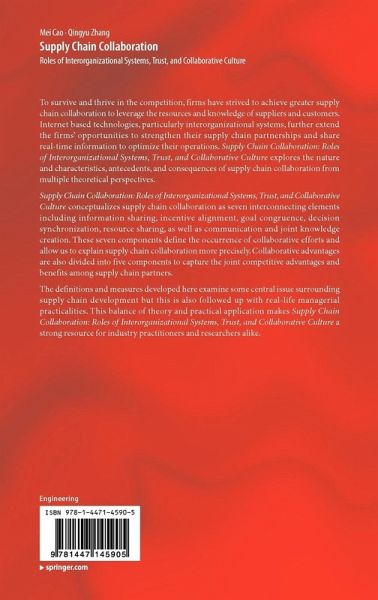 To survive and thrive in the competition, firms have strived to achieve greater supply chain collaboration to leverage the resources and knowledge of suppliers and customers. Internet based technologies, particularly interorganizational systems, further extend the firms' opportunities to strengthen their supply chain partnerships and share real-time information to optimize their operations. Supply Chain Collaboration: Roles of Interorganizational Systems, Trust, and Collaborative Culture explores the nature and characteristics, antecedents, and consequences of supply chain collaboration from multiple theoretical perspectives.