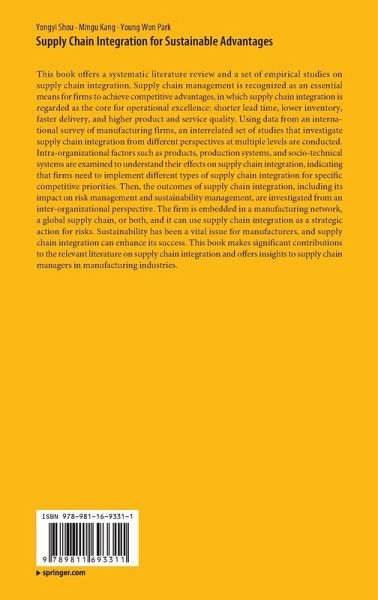 This book offers a systematic literature review and a set of empirical studies on supply chain integration. Supply chain management is recognized as an essential means for firms to achieve competitive advantages, in which supply chain integration is regarded as the core for operational excellence: shorter lead time, lower inventory, faster delivery, and higher product and service quality. Using data from an international survey of manufacturing firms, an interrelated set of studies that investigate supply chain integration from different perspectives at multiple levels are conducted. Intra-organizational factors such as products, production systems, and socio-technical systems are examined to understand their effects on supply chain integration, indicating that firms need to implement different types of supply chain integration for specific competitive priorities. Then, the outcomes of supply chain integration, including its impact on risk management and sustainability management, are investigated from an inter-organizational perspective. The firm is embedded in a manufacturing network, a global supply chain, or both, and it can use supply chain integration as a strategic action for risks. Sustainability has been a vital issue for manufacturers, and supply chain integration can enhance its success. This book makes significant contributions to the relevant literature on supply chain integration and offers insights to supply chain managers in manufacturing industries.