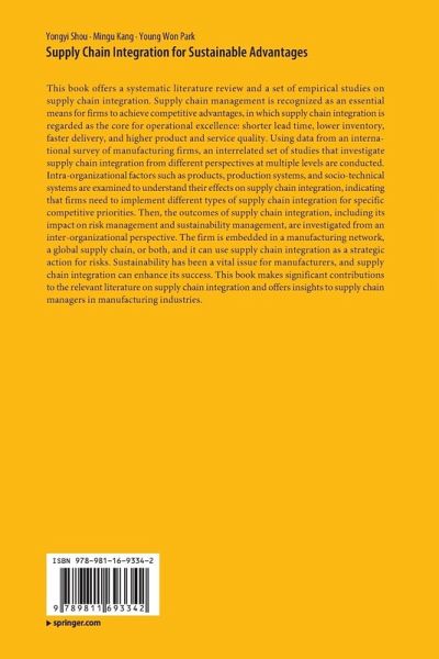 This book offers a systematic literature review and a set of empirical studies on supply chain integration. Supply chain management is recognized as an essential means for firms to achieve competitive advantages, in which supply chain integration is regarded as the core for operational excellence: shorter lead time, lower inventory, faster delivery, and higher product and service quality. Using data from an international survey of manufacturing firms, an interrelated set of studies that investigate supply chain integration from different perspectives at multiple levels are conducted. Intra-organizational factors such as products, production systems, and socio-technical systems are examined to understand their effects on supply chain integration, indicating that firms need to implement different types of supply chain integration for specific competitive priorities. Then, the outcomes of supply chain integration, including its impact on risk management and sustainability management, are investigated from an inter-organizational perspective. The firm is embedded in a manufacturing network, a global supply chain, or both, and it can use supply chain integration as a strategic action for risks. Sustainability has been a vital issue for manufacturers, and supply chain integration can enhance its success. This book makes significant contributions to the relevant literature on supply chain integration and offers insights to supply chain managers in manufacturing industries.