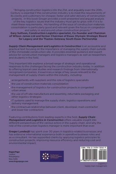 Greger Lundesjo is the owner of Lundesjo Consulting. He has extensive international experience both in operative business roles and as a consultant with a background in logistics, automation, and international marketing and management. Contributors: Rick Ballard, Founding Chairman, Construction Supply Chain Forum of the Chartered Institute of Logistics and Transport Wes Beaumont, Turner & Townsend Andy Brown, Operations Director, Mace Group Michael Browne, Professor of Logistics, University of Westminster Monika Bubholz, Sustainability Consultant, Sweco Industry AB Camilla Einarsson, Logistics Consultant, Sweco Management AB Pete Flinders, Contract Manager, Wincanton Mark Franklin, Global Parts and Supply Chain Director, Jaguar Land Rover Nick Hoare, Senior Systems Consultant, The Logistics Business Ltd. Ruvinde Kooragamage, Planner, Vinci Construction Brian Moone, Director of Supply Chain Management and Development, Mace Stephen Robbins, Logistics Manager, Laing O'Rourke Lars-Göran Sporre, Head of Business Development, Industry and Logistics, Sweco Sverige AB Jason Underwood, Director, Construct IT For Business Malcolm Waddell, WRAP Matthew Woodcock, Head of Group Logistics and Supply Chain, Lafarge Tarmac